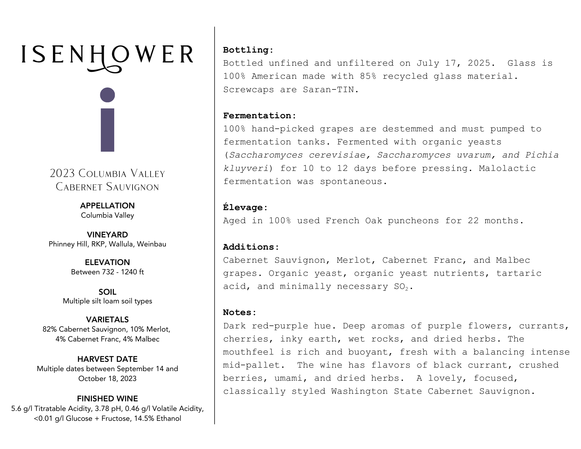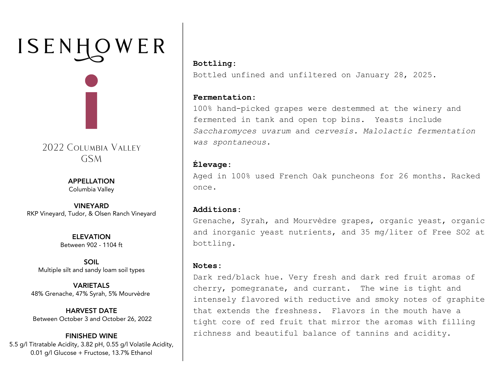The i-Label wines are hand-crafted wines made by Denise and Brett Isenhower that are exclusively for sale in restaurants and wine retailers. These wines are made from high quality and high value grapes from the Columbia Valley. The red wines are aged in neutral French Oak barrels for 12 to 16 months prior to bottling. The Viognier and Roussanne is fermented and aged in a combination of neutral French oak barrels and stainless steel tanks. The Sangiovese Rosé is fermented and aged in stainless steel tanks.